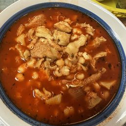 Chunks of lean pork, cooked in green chile, guacamole, and sour cream.