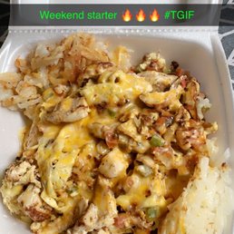 Two eggs scrambled together with shredded beef, diced onions, tomatoes & bell peppers.